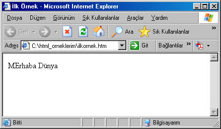 4. Şimdi dosyayı kaydedin (Dosya/Farklı Kaydet...). Dosya adı kısmına şöyle yazın: "ilkornek.htm" ve tamam'a basın. 5. Notepad'i kapatın, metin dosyasını silin ve oluşan yeni dosyayı (ilkornek.htm) açın. Dosya varsayılan browser'ınız (internet explorer vb.)tarafından açılacaktır. Aşağıdaki gibi bir sayfa açılacaktır. Böylece ilk HTML sayfamızı örneğimizi olduk. Şimdi de bu belgeyi nasıl oluşturduğumuzu birlikte inceleyelim. Kelimeleri küçük "<" ve büyük ">" sembolleri arasına yazılmaktadır. Bu ifadelere tag (etiket) denilir. Etiketler etki etmesi istenilen metnin önüne ve arkasına yazılır. Önce etiketi yazıyoruz, sonra metni yazıyoruz daha sonra aynı etiketi önüne bir bölü işaretiyle tekrar yazıyoruz. Bu son yaptığımız etiketi sonlandırıyor. Bir kaç istisna dışında tüm etiketler belge içerisinde sonlandırılmak zorunda. Burada kullandığımız etiketler ve anlamları aşağıdaki şekildedir.: <html>....</html> Tarayıcıya HTML dosyasının başladığını ve bittiğini belirmektedir. Diğer tüm kodlar bu iki etiket arasına yazılmaktadır. <head>....</head> <body>....</body> Bir HTML belgesi iki bölüme ayrılıyor: head(baş) ve body(gövde). <head>....</head> etiketleri arasına sayfa hakkında bilgiler yazıyoruz. Meta ve title gibi etiketler burada yer alıyor. <body>....</body> arası ise sayfamızın gövde bölümü. Ekranda gösterilecek kısımlar bu tagler arasında yer alıyor. Hazırlanan sayfada dikkat edelirse sadece temel etiketler kullanıldı. Yani metin biçimlendirmeye yarayan hiçbir etiket kullanılmadı. Bu yüzden <body>....</body> arasına yazılan "MErhaba Dünya" yazısı browser'ın varsayılan metin ayarlarıyla gösterilmektedir. |