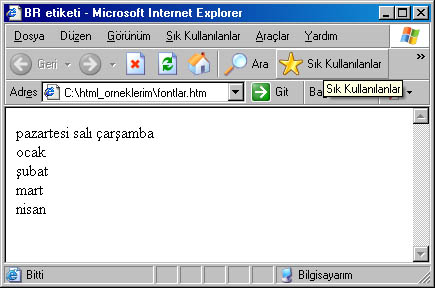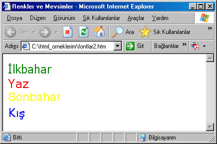 Yukarıdaki kodları çalıştırdığımızda aşağıdaki pencere ekrana gelir. Aşağıdaki örnekte ise font etiketinin kullanımını inceleyelim. Eğer kullanmak istediğiniz font bilgisayarınızda yüklü değilse font etiketi ile biçimlemek istenilen metin browser'ın varsayılan fontu ile gösterilecektir. Bu yüzden önce sisteminizde yüklü olan fontların incelenmesi gerekir. (Başlat/Ayarlar/Denetim Masası/Yazıtipleri). Buradan yazı tiplerini açarak inceleyebilir ve beğendiklerinizi kullanabilirsiniz.