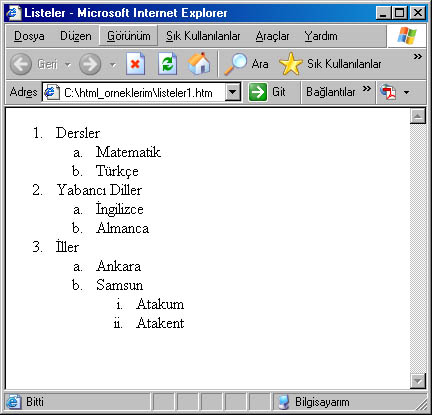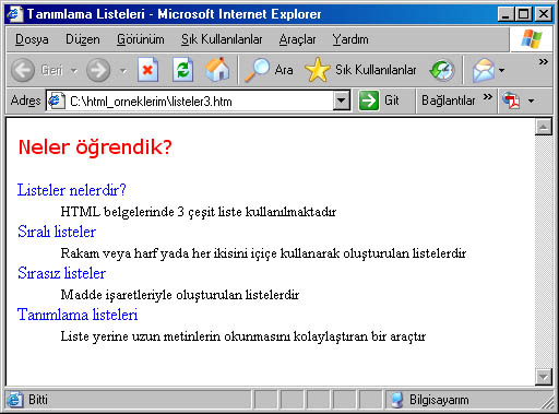 Yukarıdaki kodları çalıştırdığımızda aşağıdaki pencere ekrana gelir. 3. Tanımlama ListeleriBu listelemede kullanılan etiketleri şu şekildedir.; <dl>...</dl> , <dd>...</dd> , <dt>...</dt> Listenin maddelerini belirtmek için <li> etiketinin yerine <dd> ve <dt> etiketleri yazılır. Aynı şekilde <ol>...</ol> veya <ul>...</ul> etiketleri arasına aldığımız listede ise <dl>... </dl> etiketleri kullanılır. Yine parametre olarak <dl> etiketi içinde compact ifadesi kullanılmaktadır.. Aşağıdaki örnek kodları ve sonucunu görelim.