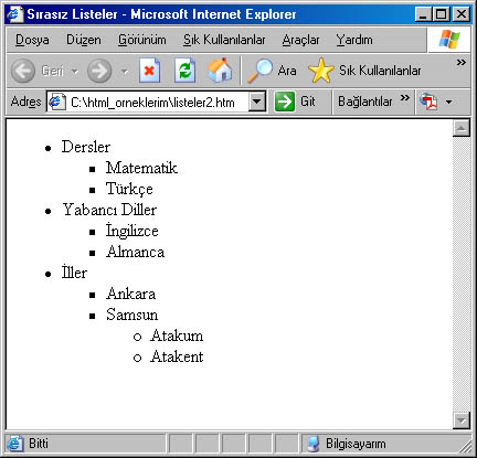 Yukarıdaki kodları çalıştırdığımızda aşağıdaki pencere ekrana gelir. Yukarıdaki örneğe dikkat edilirse <ol> etiketi ile başlayıp liste maddelerinin her birisinin başına <li> etiketini getirilmekte, liste bitirilirken </ol> etiketini yazılır. Liste içinde yeni bir liste oluşturulacaksa tekrar <ol> etiketini yazılır. Type parametresi ile maddelerin hangi şekilde başlayacağı belirlenir. (rakam/harf/romen rakamları vb.) 2. Sırasız Listeler (Unordered List)Sırasız listelerin farkı listeleme yapılırken maddelerin başına harf, rakamlar yerine küçük yuvarlaklar,kareler kullanılabilmesidir. <ol> etiketi yerine <ul> etiketi yazılmaktadır. Maddeler için <li> aynı şekilde kullanılmaktadır. <ol> için parametreler ise; type için disc (içi dolu daire), circle (içi boş daire), square (içi dolu kare). Compact parametresi sırasız listelerde de kullanılabiliyor. Aşağıdaki örnek kodları ve sonucunu görelim.