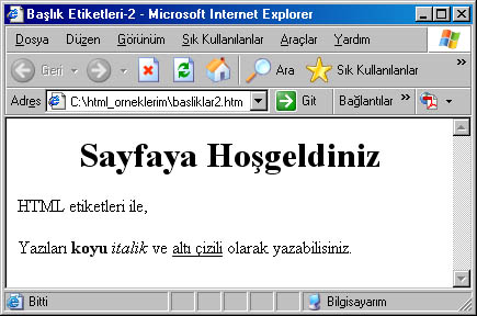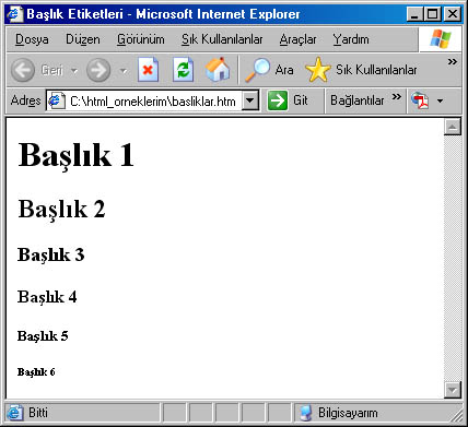 Yukarıdaki kodları çalıştırdığımızda aşağıdaki pencere ekrana gelir. Sayfanın işleyişine baktığımızda, önce her zaman yapmamız gerektiği gibi html, head, title etiketlerini yerleştirdik. Sayfa başlığı (title) olarak "Başlık Etiketleri"ni seçtik ve sayfanın gövde (body) kısmına istediğimiz metinleri yazdık ve bu metinleri h1'den h6'ya kadar olan biçimlendirme etiketlerinin arasına aldık. Browser metin biçimleme etiketleri olan <h1>...<h6> etiketleri arasındaki kelimelere belirli büyüklükler verdi. Diğer etiketleri kullanarak yeni bir HTML dosyası oluşturalım. Kodlar aşağıdaki şekilde olsun: