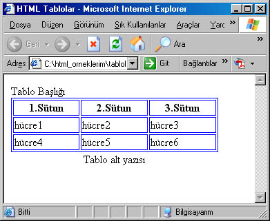 Yukarıdaki kodları çalıştırdığımızda aşağıdaki pencere ekrana gelir. Tablolarda satır ve sütunların birleştirilmesi de yapılabilmektedir. Bu işlemler için; Ayrıca daha hassas ayarların yapılması için table etiketi içerisinde style parametrelerinden yararlanılır. Aşağıdaki örneklerde ayrı ayrı etiketler gösterilmiştir. Farklı olan bölümler kalın olarak yazdırılmış ve örneği yan tarafta gösterilmiştir.